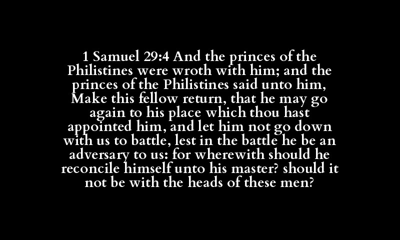 1 Samuel 29:4 And the princes of the Philistines were wroth with him; and the princes of the Philistines said unto him, Make this fellow return, that he may go again to his place which thou hast appointed him, and let him not go down with us to battle, lest in the battle he be an adversary to us: for wherewith should he reconcile himself unto his master? should it not be with the heads of these men?