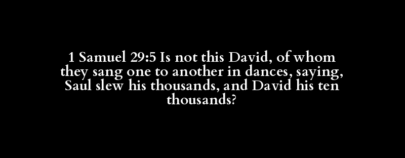 1 Samuel 29:5 Is not this David, of whom they sang one to another in dances, saying, Saul slew his thousands, and David his ten thousands?