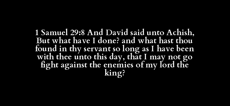 1 Samuel 29:8 And David said unto Achish, But what have I done? and what hast thou found in thy servant so long as I have been with thee unto this day, that I may not go fight against the enemies of my lord the king?