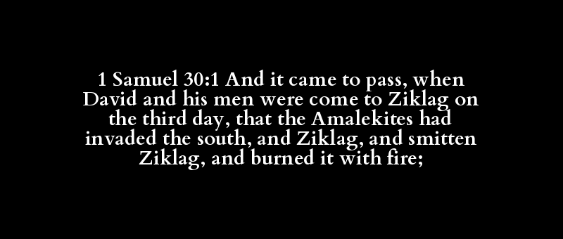1 Samuel 30:1 And it came to pass, when David and his men were come to Ziklag on the third day, that the Amalekites had invaded the south, and Ziklag, and smitten Ziklag, and burned it with fire;
