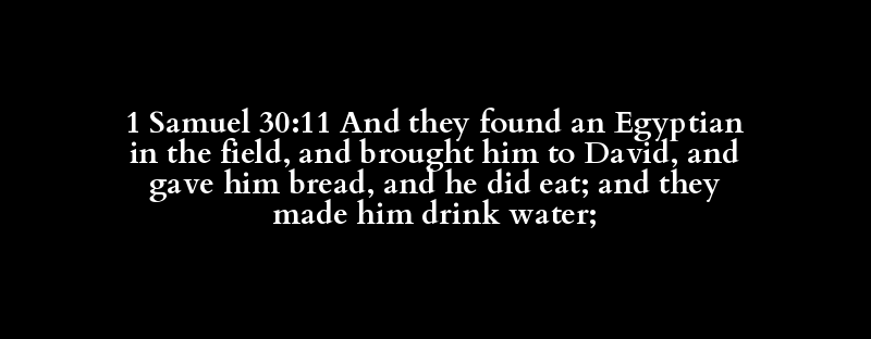 1 Samuel 30:11 And they found an Egyptian in the field, and brought him to David, and gave him bread, and he did eat; and they made him drink water;