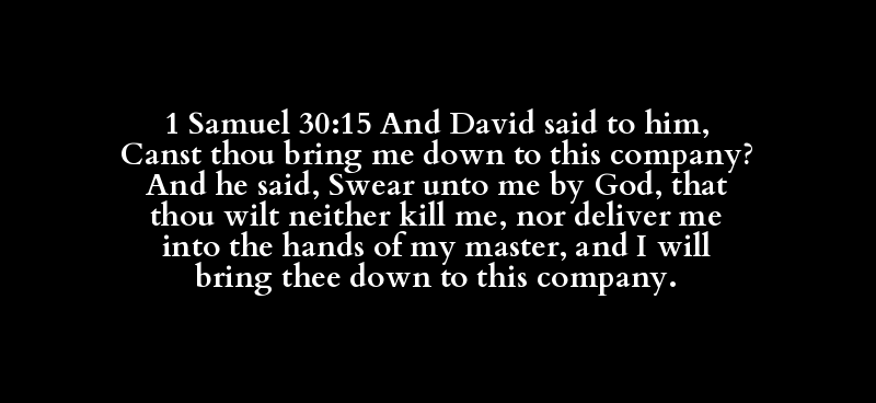 1 Samuel 30:15 And David said to him, Canst thou bring me down to this company? And he said, Swear unto me by God, that thou wilt neither kill me, nor deliver me into the hands of my master, and I will bring thee down to this company.