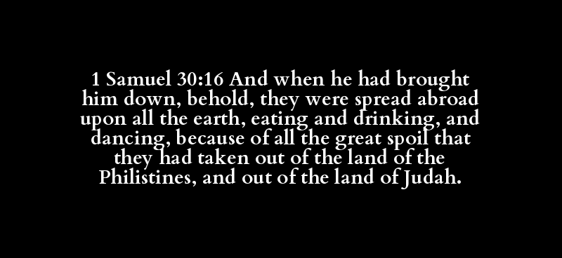 1 Samuel 30:16 And when he had brought him down, behold, they were spread abroad upon all the earth, eating and drinking, and dancing, because of all the great spoil that they had taken out of the land of the Philistines, and out of the land of Judah.