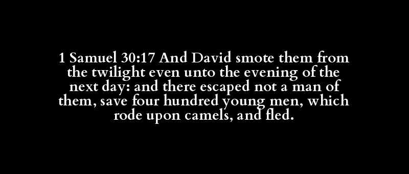 1 Samuel 30:17 And David smote them from the twilight even unto the evening of the next day: and there escaped not a man of them, save four hundred young men, which rode upon camels, and fled.