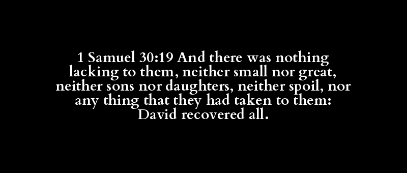 1 Samuel 30:19 And there was nothing lacking to them, neither small nor great, neither sons nor daughters, neither spoil, nor any thing that they had taken to them: David recovered all.