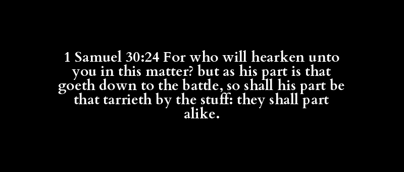 1 Samuel 30:24 For who will hearken unto you in this matter? but as his part is that goeth down to the battle, so shall his part be that tarrieth by the stuff: they shall part alike.