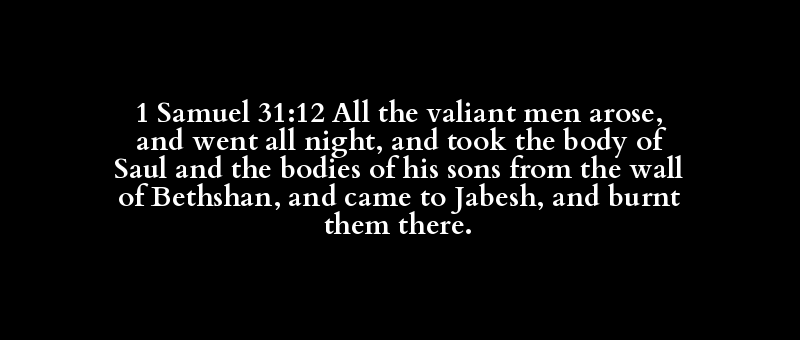 1 Samuel 31:12 All the valiant men arose, and went all night, and took the body of Saul and the bodies of his sons from the wall of Bethshan, and came to Jabesh, and burnt them there.