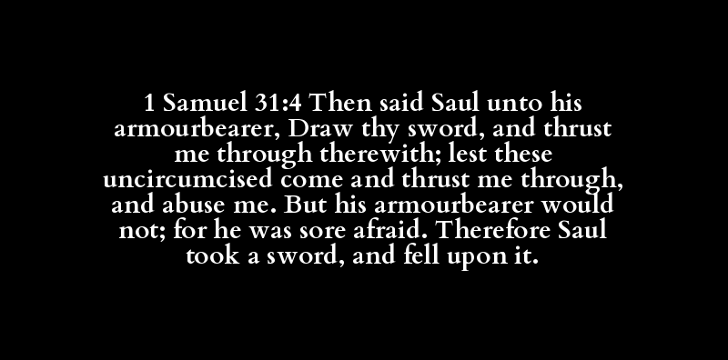 1 Samuel 31:4 Then said Saul unto his armourbearer, Draw thy sword, and thrust me through therewith; lest these uncircumcised come and thrust me through, and abuse me. But his armourbearer would not; for he was sore afraid. Therefore Saul took a sword, and fell upon it.