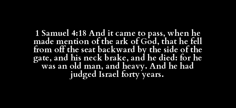 1 Samuel 4:18 And it came to pass, when he made mention of the ark of God, that he fell from off the seat backward by the side of the gate, and his neck brake, and he died: for he was an old man, and heavy. And he had judged Israel forty years.