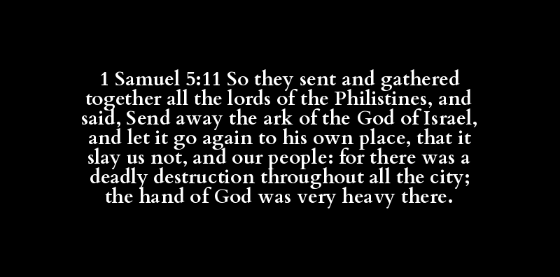 1 Samuel 5:11 So they sent and gathered together all the lords of the Philistines, and said, Send away the ark of the God of Israel, and let it go again to his own place, that it slay us not, and our people: for there was a deadly destruction throughout all the city; the hand of God was very heavy there.