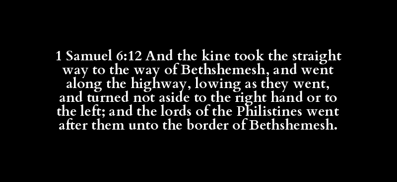 1 Samuel 6:12 And the kine took the straight way to the way of Bethshemesh, and went along the highway, lowing as they went, and turned not aside to the right hand or to the left; and the lords of the Philistines went after them unto the border of Bethshemesh.