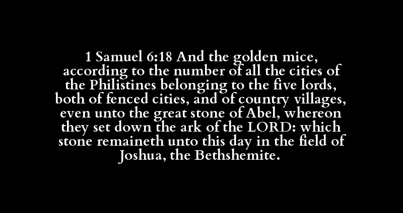 1 Samuel 6:18 And the golden mice, according to the number of all the cities of the Philistines belonging to the five lords, both of fenced cities, and of country villages, even unto the great stone of Abel, whereon they set down the ark of the LORD: which stone remaineth unto this day in the field of Joshua, the Bethshemite.