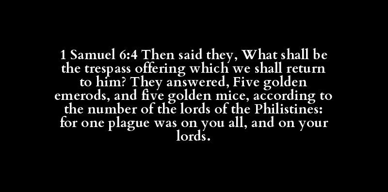 1 Samuel 6:4 Then said they, What shall be the trespass offering which we shall return to him? They answered, Five golden emerods, and five golden mice, according to the number of the lords of the Philistines: for one plague was on you all, and on your lords.