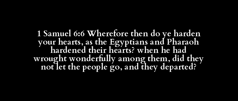 1 Samuel 6:6 Wherefore then do ye harden your hearts, as the Egyptians and Pharaoh hardened their hearts? when he had wrought wonderfully among them, did they not let the people go, and they departed?