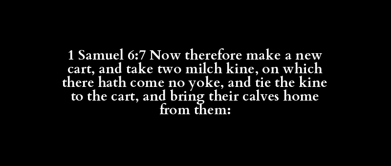 1 Samuel 6:7 Now therefore make a new cart, and take two milch kine, on which there hath come no yoke, and tie the kine to the cart, and bring their calves home from them: