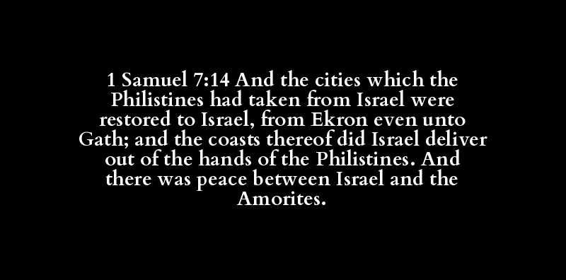 1 Samuel 7:14 And the cities which the Philistines had taken from Israel were restored to Israel, from Ekron even unto Gath; and the coasts thereof did Israel deliver out of the hands of the Philistines. And there was peace between Israel and the Amorites.