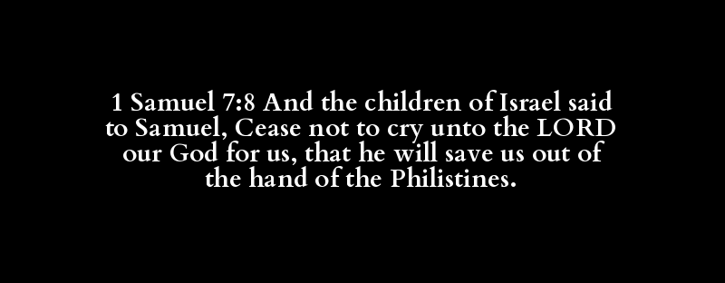 1 Samuel 7:8 And the children of Israel said to Samuel, Cease not to cry unto the LORD our God for us, that he will save us out of the hand of the Philistines.