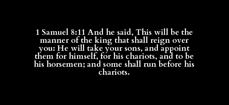 1 Samuel 8:11 And he said, This will be the manner of the king that shall reign over you: He will take your sons, and appoint them for himself, for his chariots, and to be his horsemen; and some shall run before his chariots.