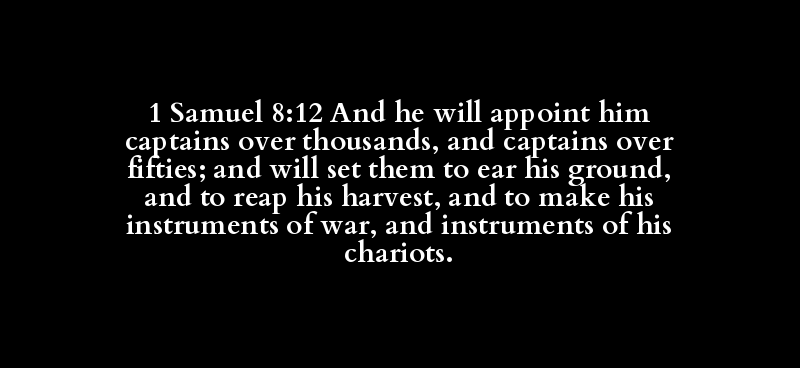1 Samuel 8:12 And he will appoint him captains over thousands, and captains over fifties; and will set them to ear his ground, and to reap his harvest, and to make his instruments of war, and instruments of his chariots.
