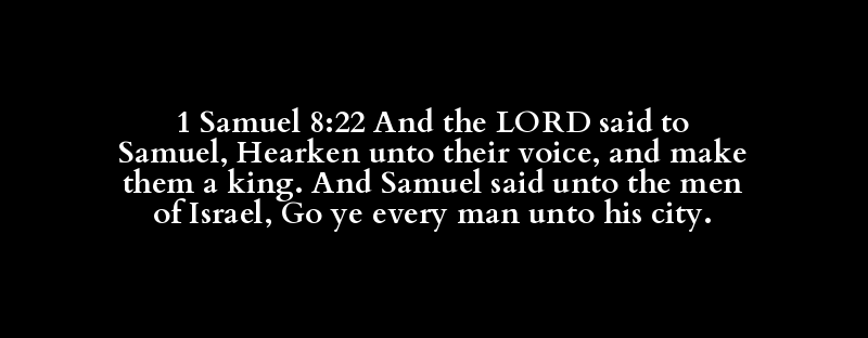 1 Samuel 8:22 And the LORD said to Samuel, Hearken unto their voice, and make them a king. And Samuel said unto the men of Israel, Go ye every man unto his city.