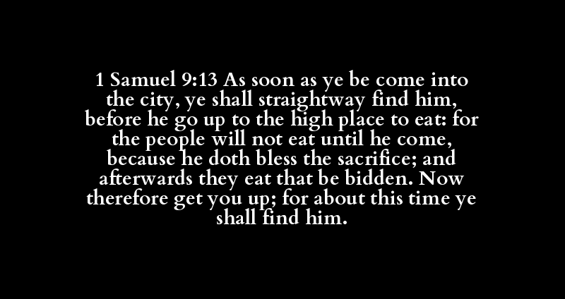 1 Samuel 9:13 As soon as ye be come into the city, ye shall straightway find him, before he go up to the high place to eat: for the people will not eat until he come, because he doth bless the sacrifice; and afterwards they eat that be bidden. Now therefore get you up; for about this time ye shall find him.