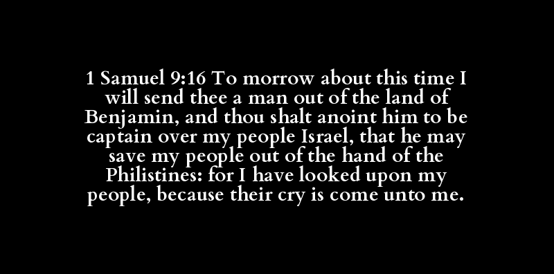 1 Samuel 9:16 To morrow about this time I will send thee a man out of the land of Benjamin, and thou shalt anoint him to be captain over my people Israel, that he may save my people out of the hand of the Philistines: for I have looked upon my people, because their cry is come unto me.