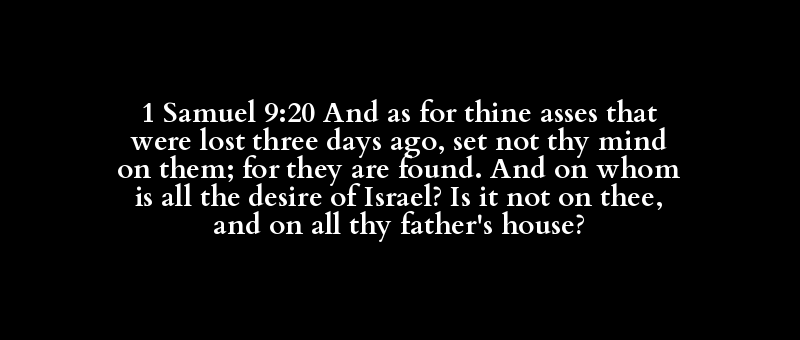 1 Samuel 9:20 And as for thine asses that were lost three days ago, set not thy mind on them; for they are found. And on whom is all the desire of Israel? Is it not on thee, and on all thy father's house?