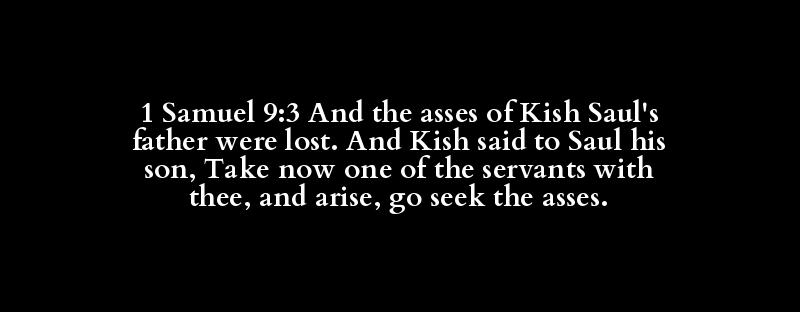 1 Samuel 9:3 And the asses of Kish Saul's father were lost. And Kish said to Saul his son, Take now one of the servants with thee, and arise, go seek the asses.