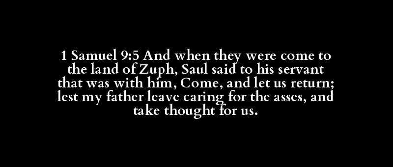 1 Samuel 9:5 And when they were come to the land of Zuph, Saul said to his servant that was with him, Come, and let us return; lest my father leave caring for the asses, and take thought for us.